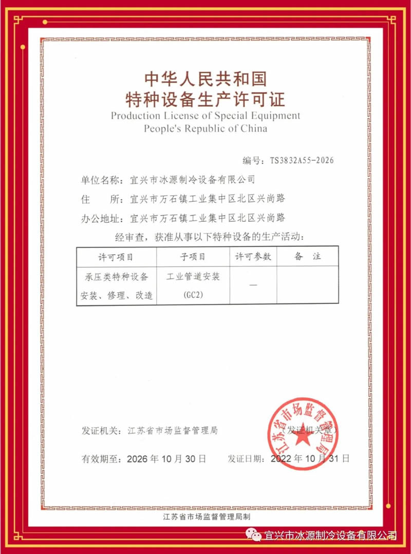熱烈祝賀宜興冰源獲得特種設備生產許可證